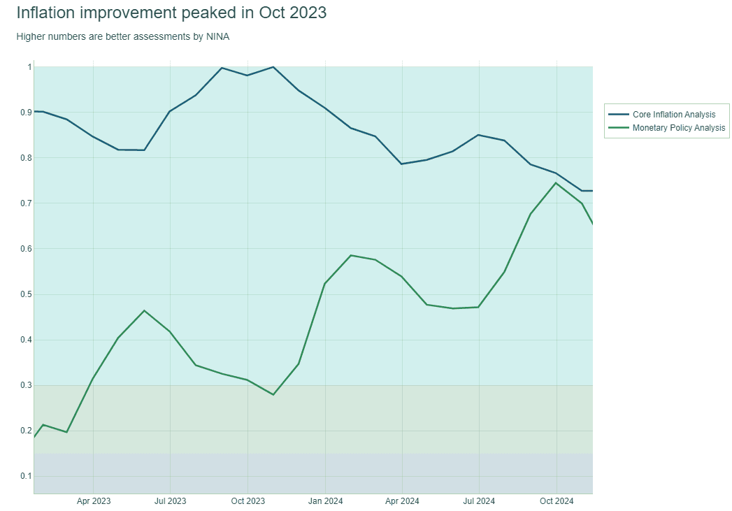 The graph below shows the aggregate analysis scores of NINA for core inflation and monetary policy. Notably, the inflation trajectory peaked in October 2023 and has been declining since. The monetary policy score looks to also start to peak around this stage.