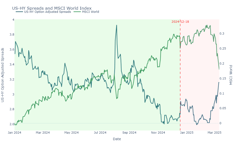 This cocktail of forces leaves little room for anything other than a correction or rotation. Now, imagine an alternative policy scenario—a coordinated pro-growth agenda. In that case, real yields would rise, SOFR-treasury spreads would widen, and the 1-year forward 1-year inflation swap would increase. Markets would grow scared and sell, in fear of overheating. With treasury yields reaching 4.8%, driven by real yields and term premia, this scenario mirrors the market fears we observed just two months ago.