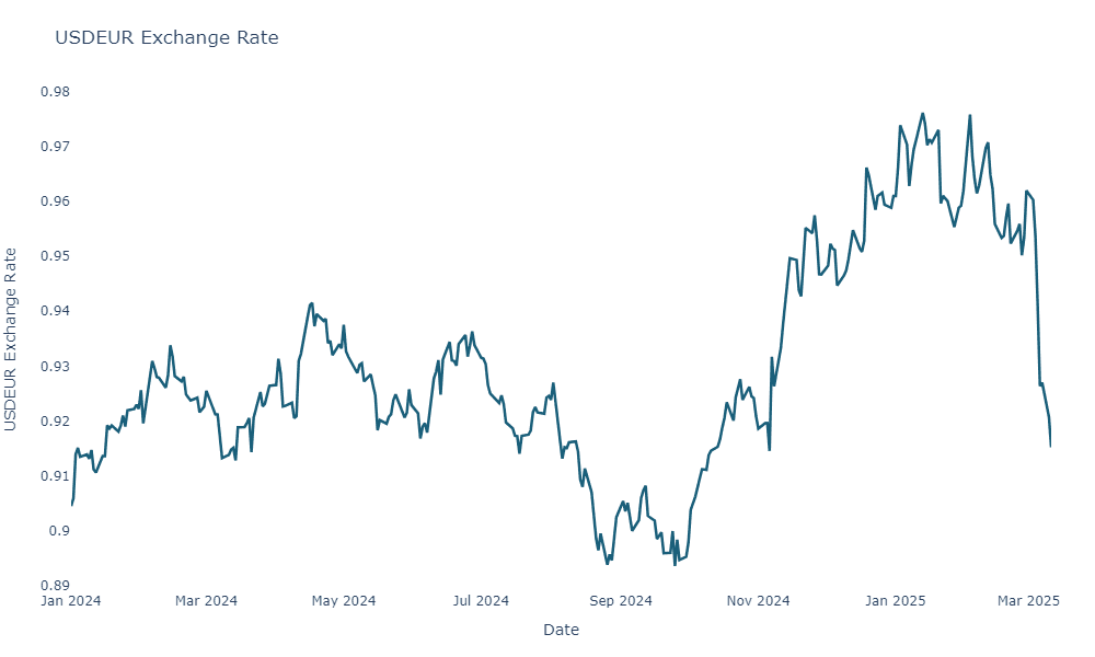 Currently, we are primarily holding cash. Our FX strategy is straightforward: we keep our USD exposure roughly equal to the percentage of USD- denominated assets we expect to buy when re-entering the market. As a result, we do have USDEUR exposure. For us, this is just mark-to-market volatility, manageable during these times and, given the mean-reventing properties of FX, an effect that can reverse over time. That said, we expect this to be a factor that will hurt us in March, a nuisance, but part of the process. As shown below, it has depreciated from a US Dollar nearly equivalent to 1 Euro to now approximately 0.9 Euro—a decline approaching 10% from its peak!