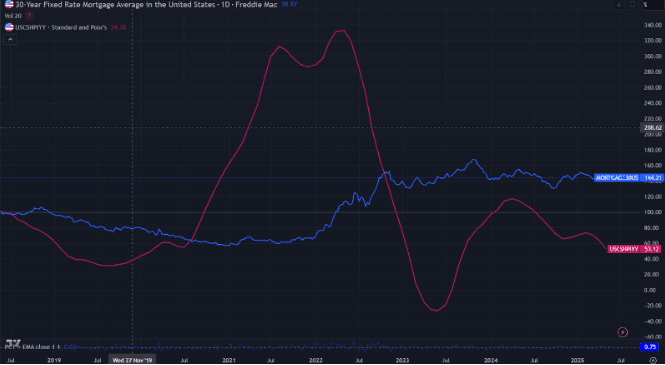 On housing, our core thesis remains: inelasticity of housing demand is reaching a real ceiling in the US, either mortgage rates or prices should correct. As said before, weaker housing will have a dampening effect on inflation and we remain in the medium-term disinflationary camp. Below we have in blue the 30yr mortgage rate that remains elevated and in red the Case-Shiller housing price index, which is back on a downward trend again.
