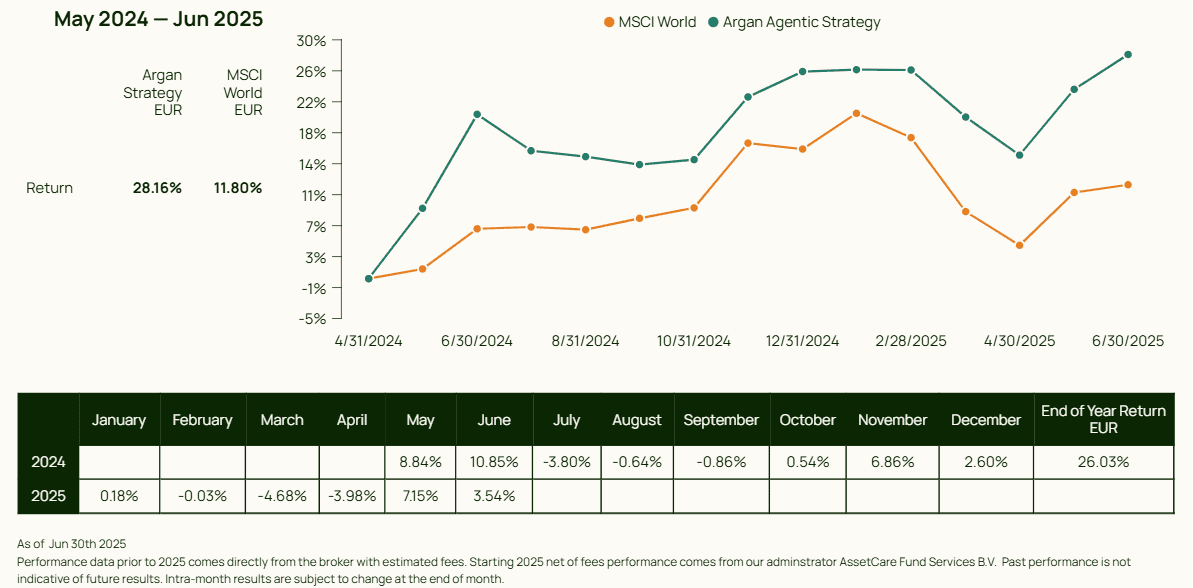 It was a fantastic month, delivering a 7.1% return (USD), 3.54% (EUR). That brings our returns since inception to 28.16% versus the 11.80% of the MSCI World and 41.55% versus 24.49% in USD. Again, without the dire drawdowns we saw in the turbulent months of 2024 and April this year.