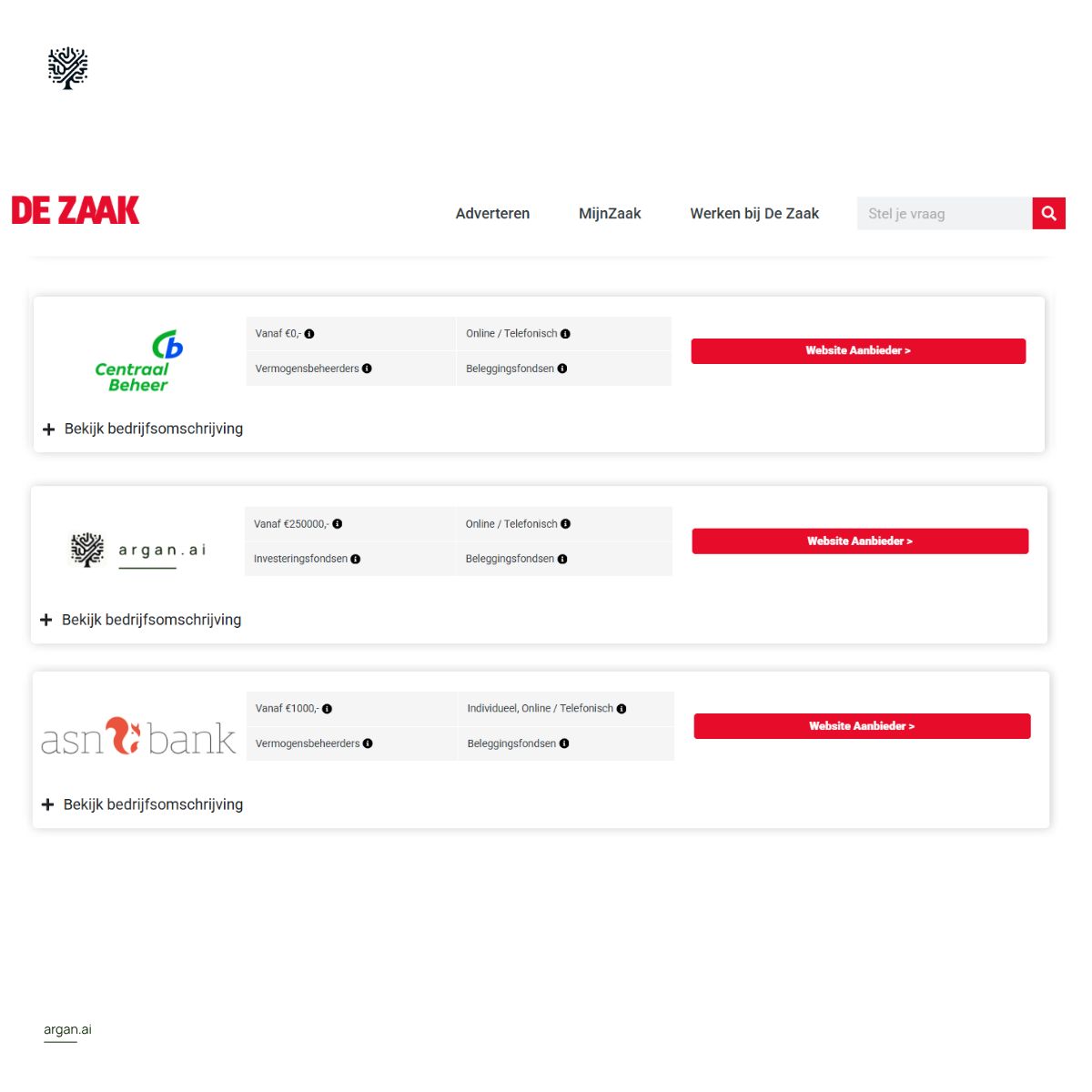 argan.ai found its way into De Zaak's 2025 overview of investment funds. De Zaak is focused on Dutch entrepreneurs, and so are we, by offering entrepreneurs an investment solution that works for them. It's a small thing to get listed, yet another sign our investment strategy, powered by AI, is steadily finding its place in the mainstream conversation.